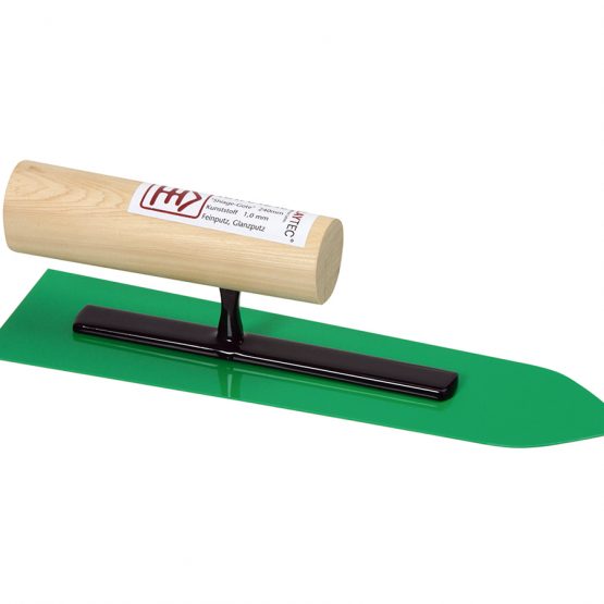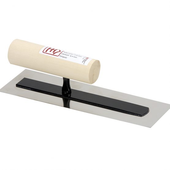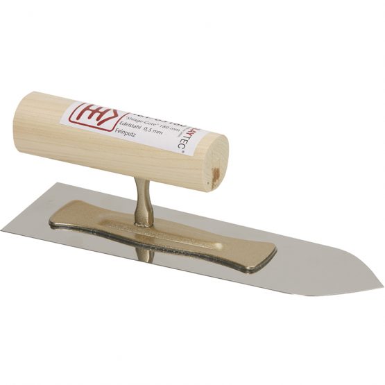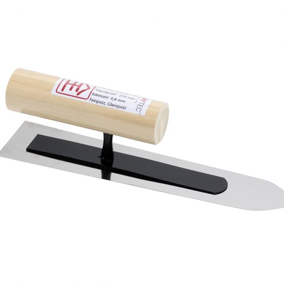 Edelstahl gewalzt, sehr feines und biegsames Blatt mit flacher, vorne abgerundeter Rückenverstärkung. Blattstärke 0,3 mm. Kelle für das Glätten und die Endbearbeitung von Lehm-Feinputzen. Besonders geeignet für Lehm Glanzputzoberflächen.